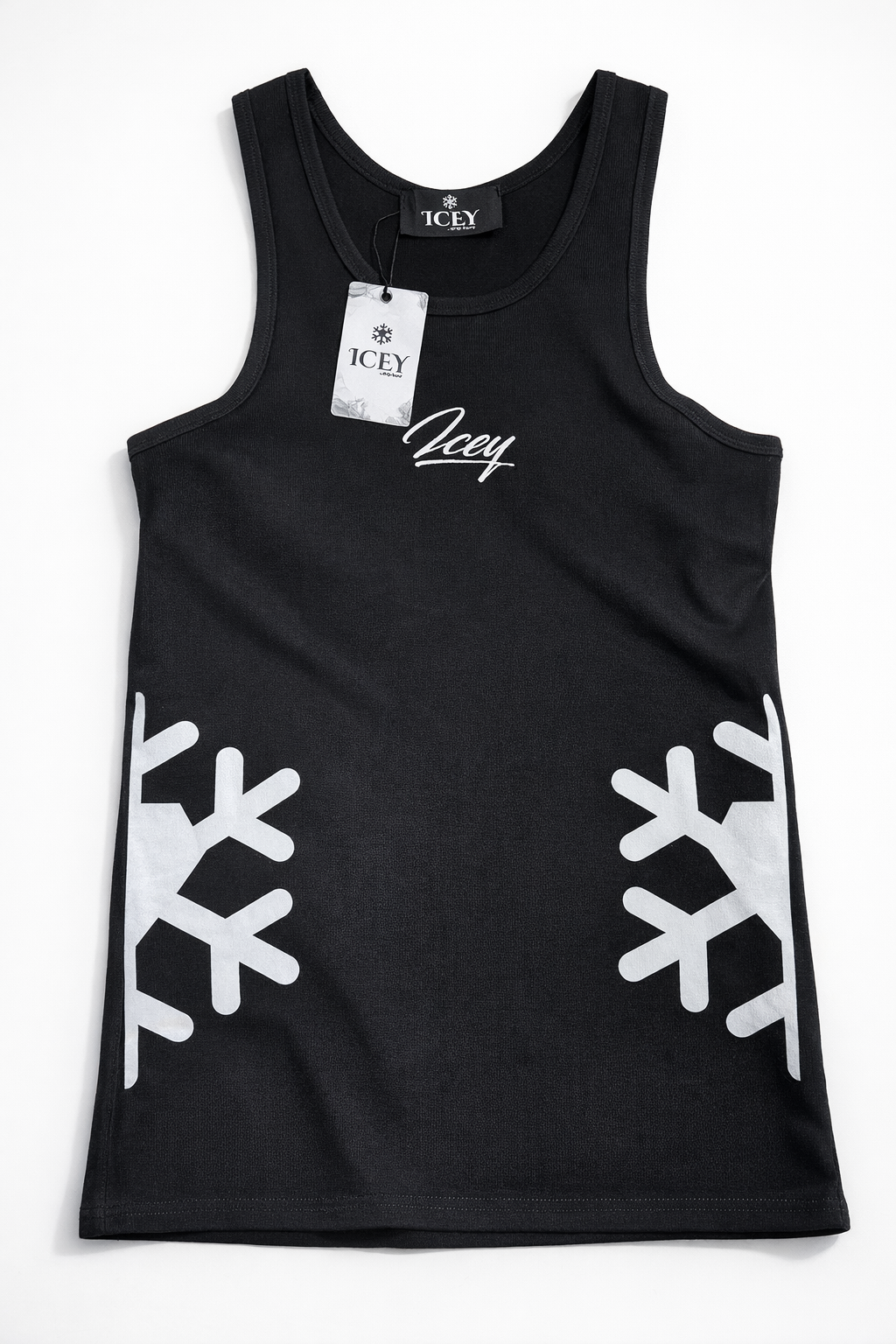 Icey Sleeveless with the signature “Icey” logo at the chest, accented by oversized white snowflake prints on each side near the hem. This design blends minimalism with a striking winter-themed graphic, creating a fresh and edgy aesthetic.