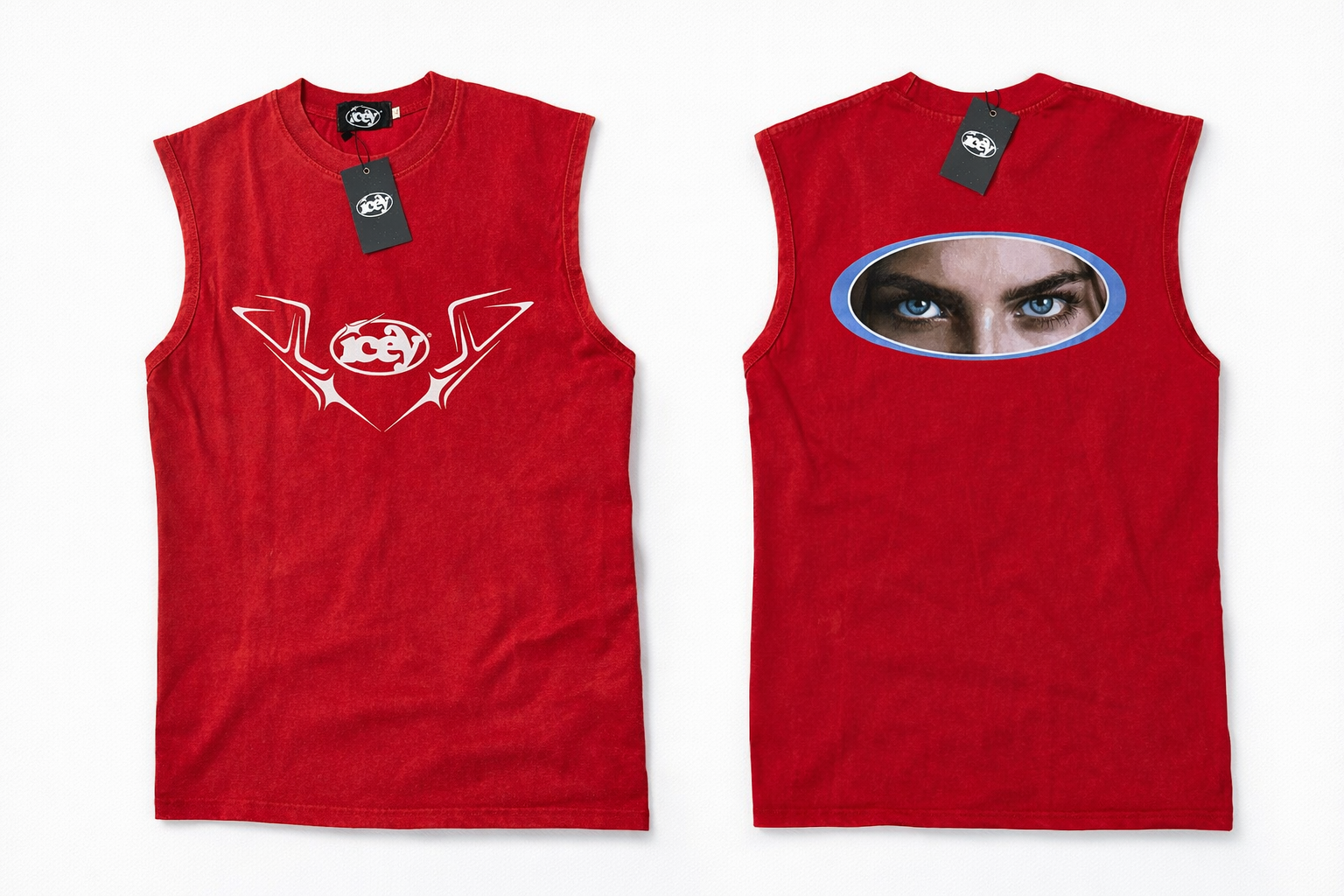 The sleeveless cut gives it a clean, athletic edge—perfect for warm weather, layering, or making a statement on its own. On the front, the signature Icey graphic emblem is boldly printed, representing strength, individuality, and the fearless Icey lifestyle. The back features a striking eye graphic, symbolizing awareness, vision, and confidence—designed to turn heads from every angle.