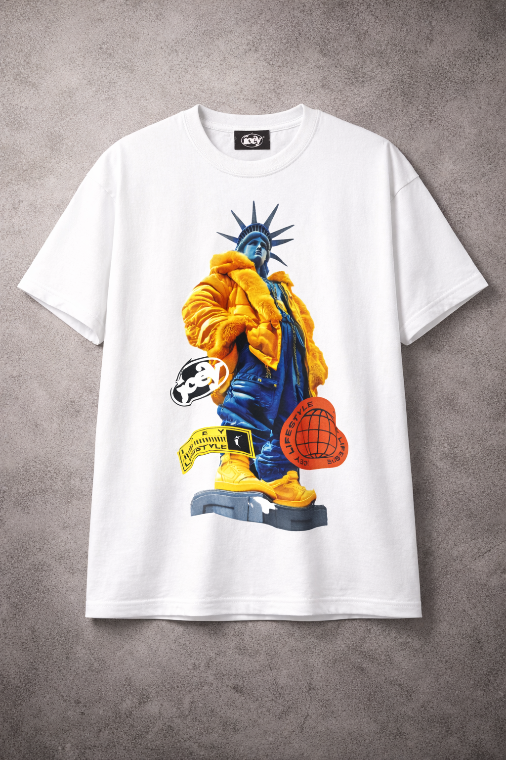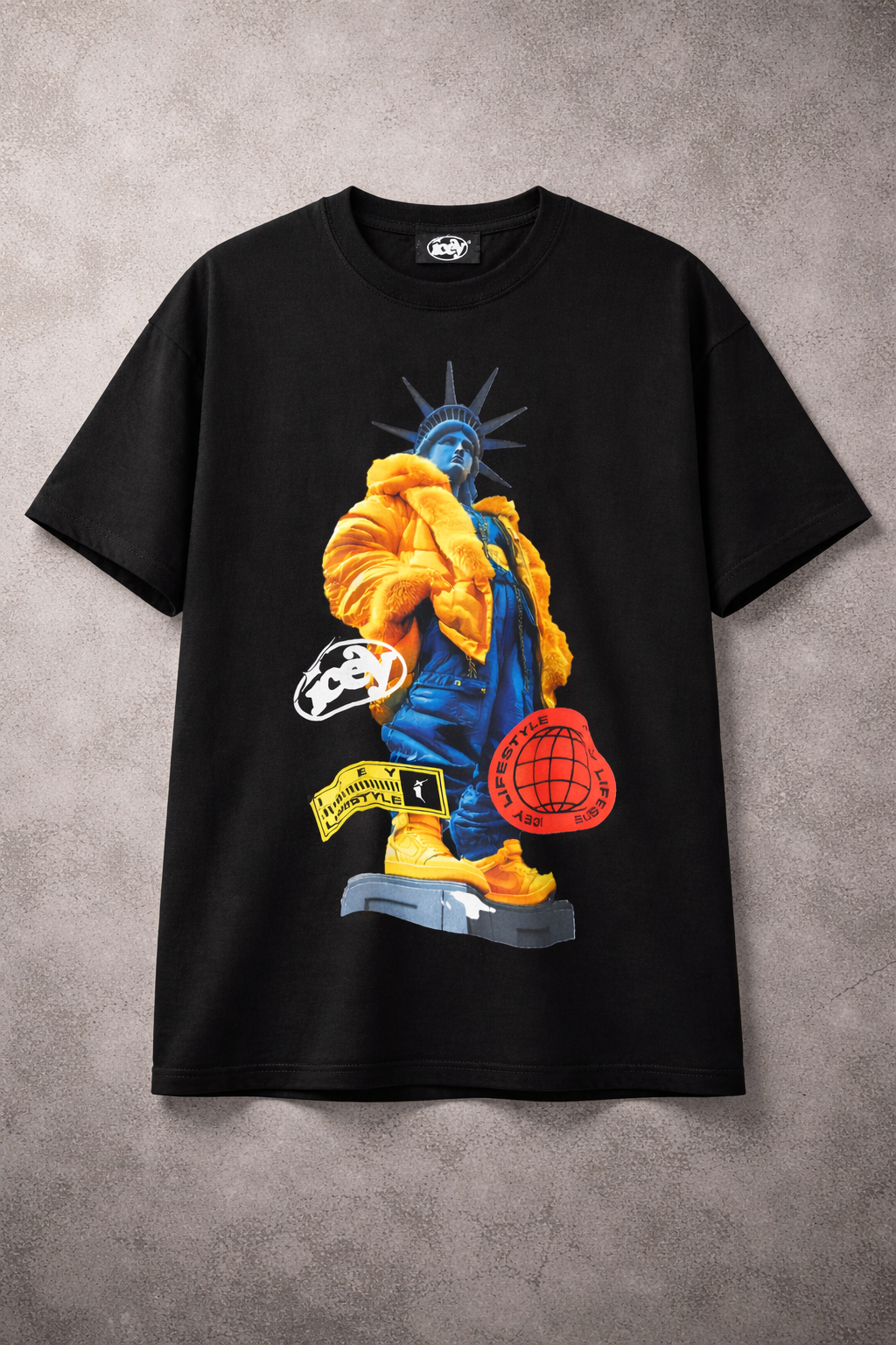 This bold graphic T-shirt features a striking urban-art design of the Statue of Liberty dressed in oversized streetwear — a yellow puffer jacket, blue pants, and yellow sneakers — giving the iconic figure a fresh, modern twist. The shirt is decorated with layered graphics, including the word “Lifestyle” in large script, an orange globe emblem, and Icey Lifestyle branding elements that add an edgy, fashion-forward vibe.
