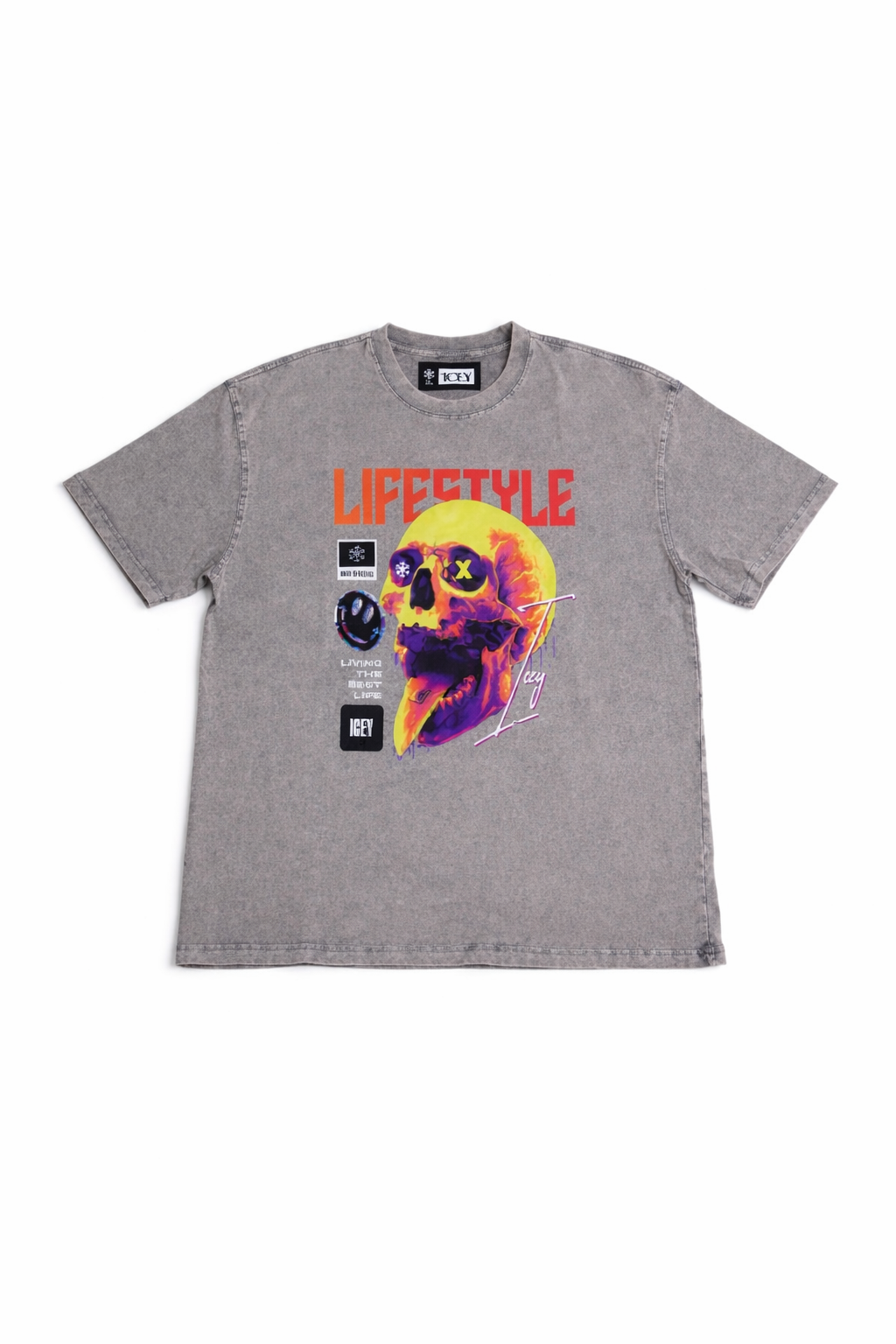 • Branding: Bold, slightly distressed text reading “LIFESTYLE” is arched over the skull in an eye-catching gradient of orange to red. The “ICEY” brand name is prominently featured in a black block graphic at the bottom.