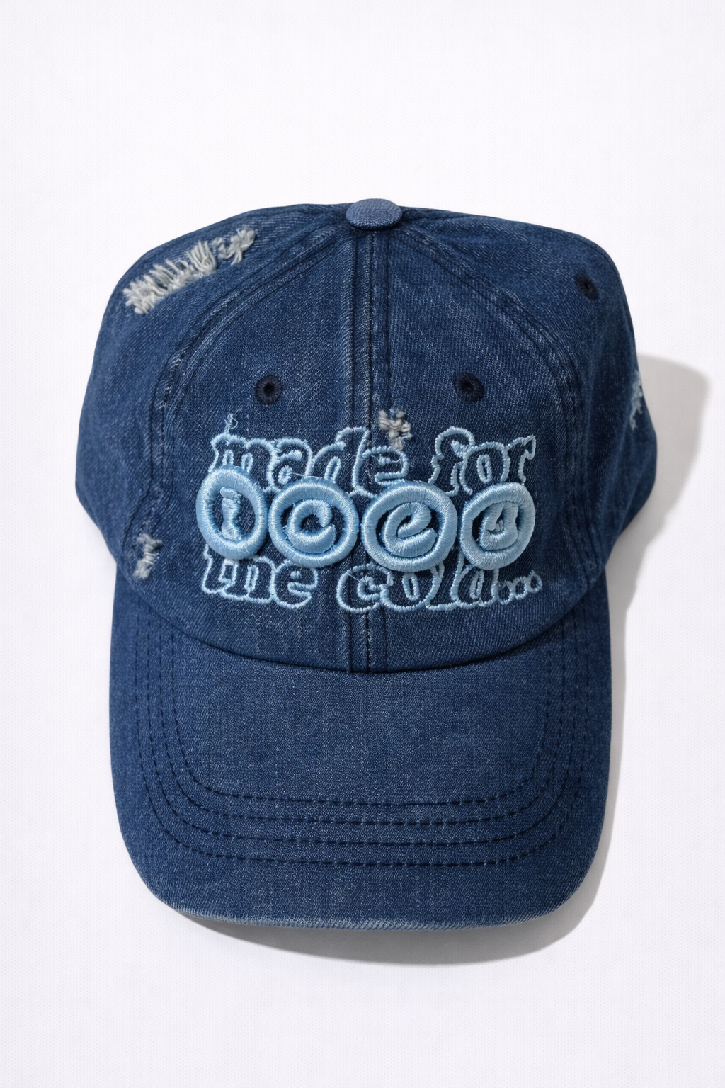 Step into bold expression with the Icey denim cap — a standout piece from our street-luxe line. Made from soft blue jean fabric, this cap features the signature “Made for the Cold” slogan embroidered in bold lettering, with playful Icey logos worked into the design. The side panel showcases sneaker footprints, adding an urban touch, while the back and under-brim designs deliver full-circle detail.